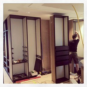 Dunkelgraue Seidenteppiche und hellgraue japanische Hanftapeten runden das Bild ab. Die wertvollen Einbauten in der Ankleide, der Lederschrank im Zentrum des privaten Trakts, sowie die Vitrinen im Küchenbereich sind markante Eckpfeiler des massgeschneiderten Designs.